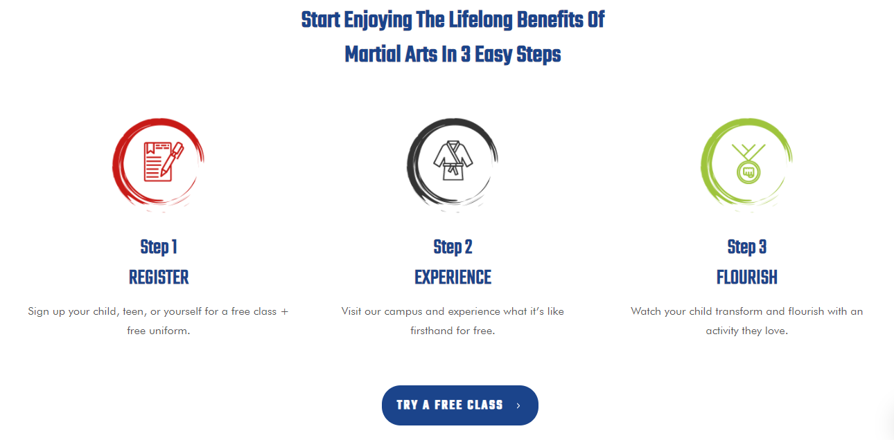 Notice the headline describes how easy the process is. Next, the 3 steps break down the process clearly, making it easy for parents to understand exactly how their child (and themselves!) will benefit from doing karate with the American Academy of Martial Arts in particular. Finally, the obvious CTA "Try a Free Class," tells their audience exactly what to do to get started.