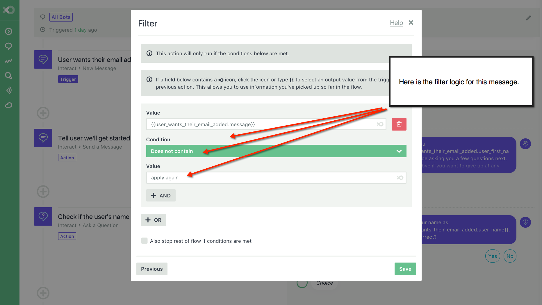 Here you can see the filter logic. This message is conditional in that it is skipped if their name is correct.