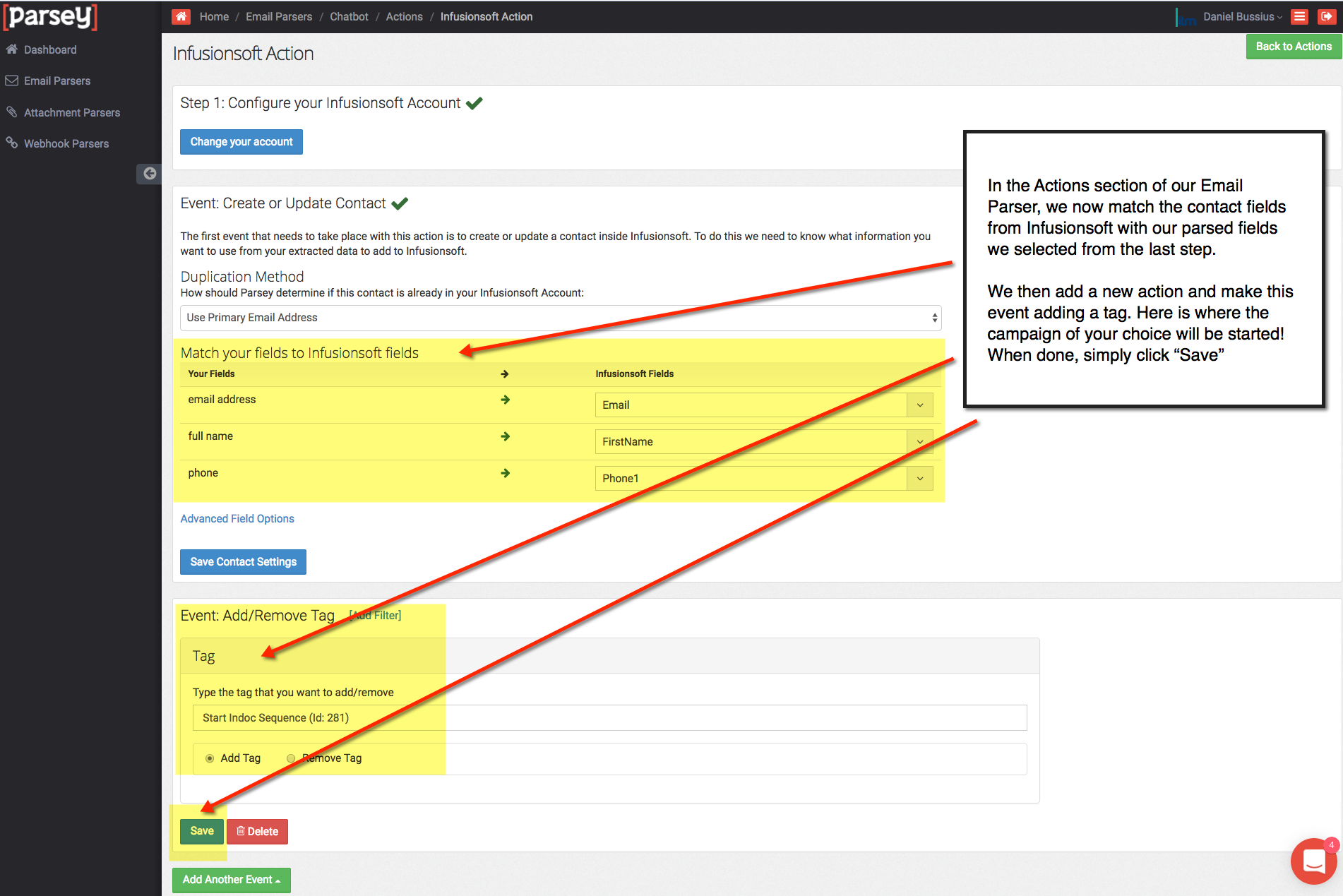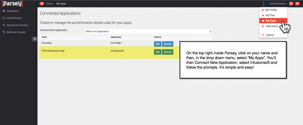 On the top right inside Parsey, click on your name and then, in the drop down menu, select “My Apps”. You’ll then Connect New Application, select Infusionsoft and follow the prompts. It’s simple and easy!