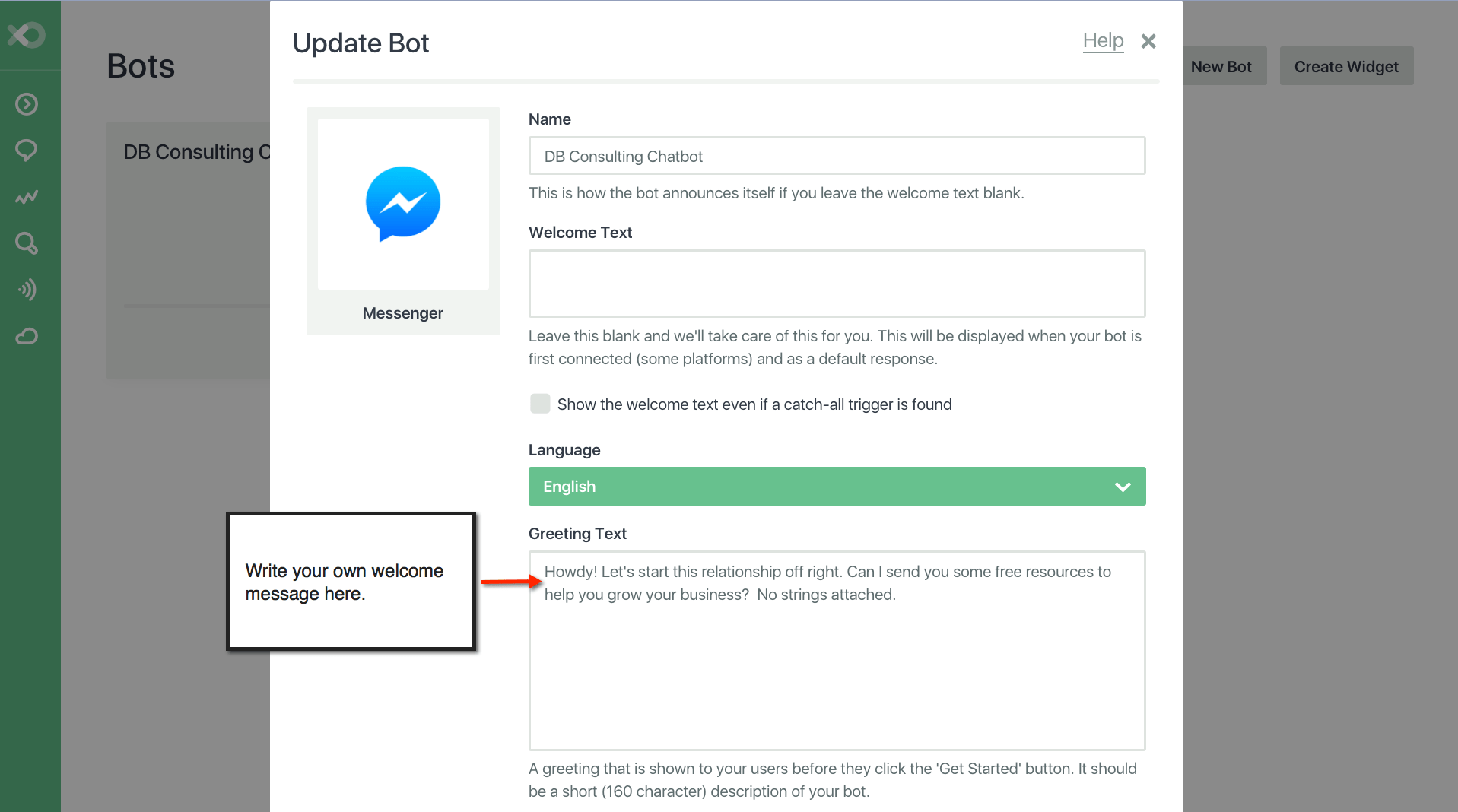 Here you see where I am writing a playful greeting for my bot. I did not write a welcome text as I didn't feel that it is necessary to have both a welcome and a greeting text.