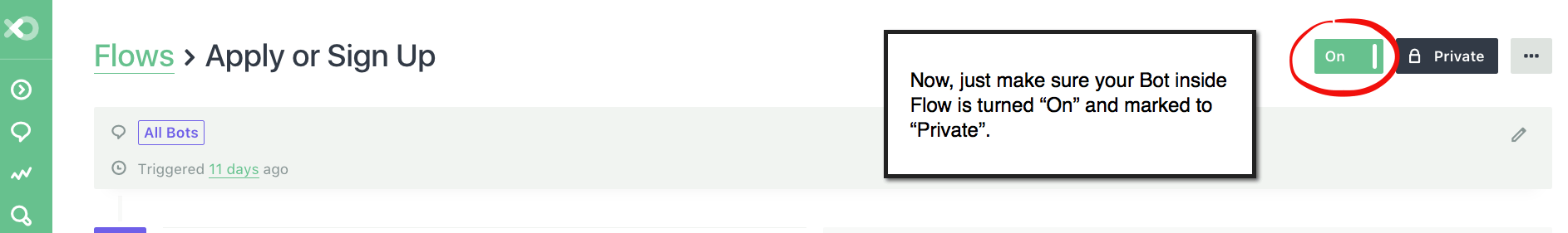 Once more, please head back over to Flow and, under the Flows Section, click the button that turns your bot ON. (see above image). Make sure you keep the Flow as Private.