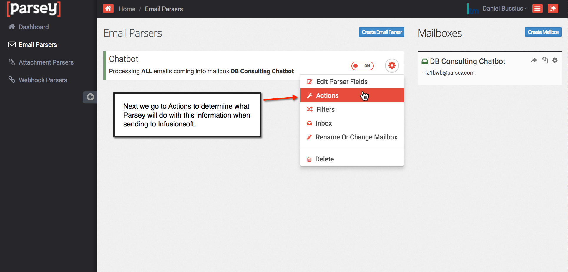 Now, click on "Actions" and we are going to now parse the fields from your test message that was sent over to Parsey.